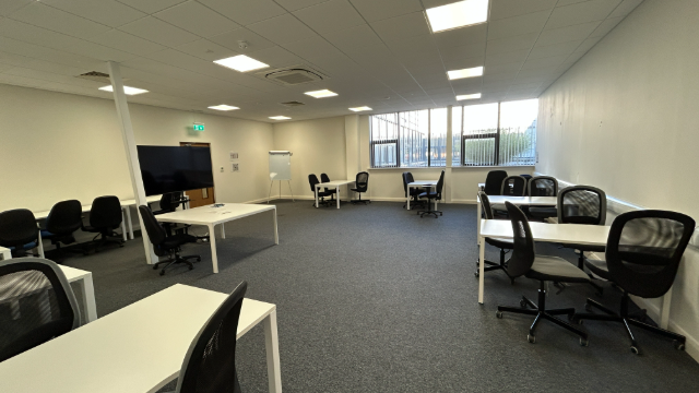 Bright training space that adapts to classroom, U‑shape or workshop formats—ready for onboarding, team training or community events.