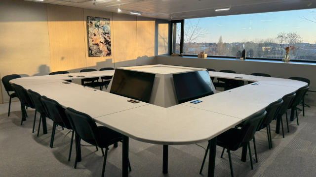 Large-format boardroom with its square setup (25 seats) equipped with four TV screens in the center for perfect visibility, no matter where you are seated. Ideal for sharing slides, monitoring dashboards, or facilitating a hybrid meeting.